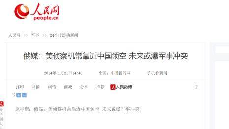 人民网《俄媒:美侦察机常靠近中国领空 未来或爆军事冲突》