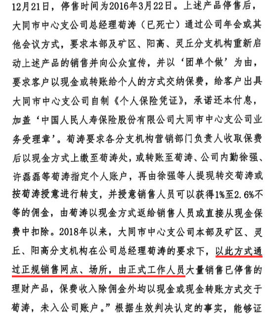 根据大同市平城区人民法院刑事判决书认定事实显示,大同市中心支公司本部及矿区、灵丘、阳高分支机构在荀涛要求下,通过正规销售网点、场所,由正式工作人员大量销售已停售的理财产品,保费收入除佣金外均以现金或现金转账方式交给荀涛,未入公司账户。