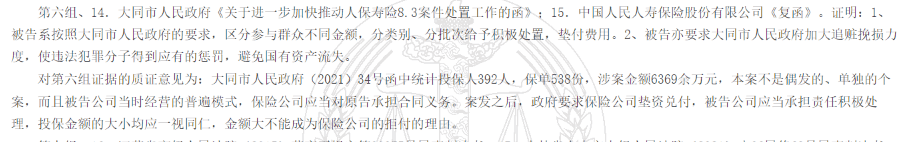 根据当地政府统计“投保人”有392人,涉及保单538份,涉案金额6369万元。险联社获取的判决书显示,其中“投保人”也包括了荀涛的直系亲属。
