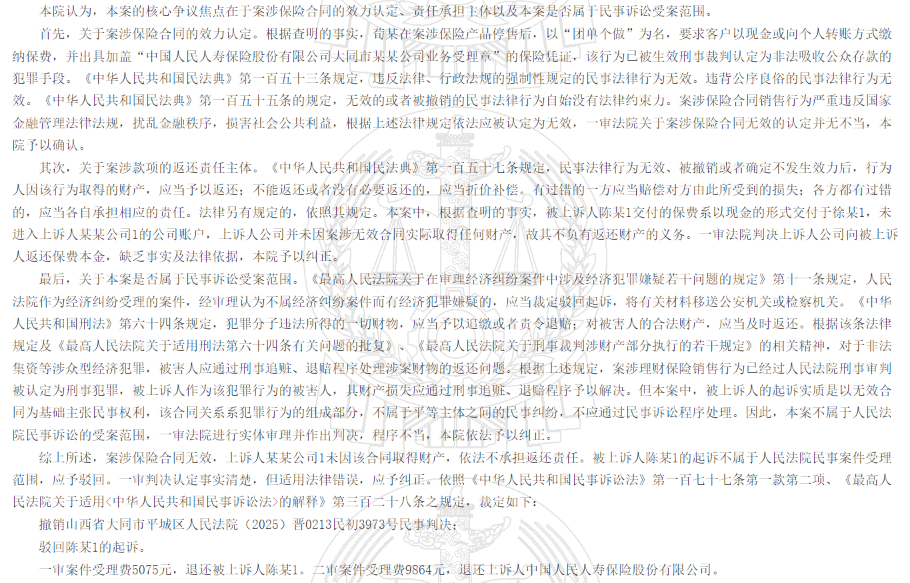 部分未拿到退款的受害人纷纷将人保寿险大同中心支公司起诉到法庭,一审多判决人保寿险大同中心支公司退还保险费本金,而二审则撤销了一审判决结果,认为案涉保险合同无效,人保寿险大同中心支公司未因该合同取得财产,依法不承担返还责任。