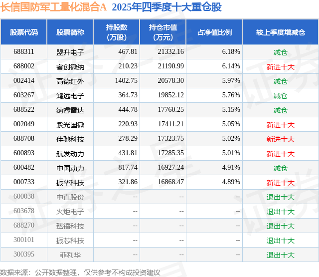 长信国防军工量化混合A的前十大重仓股如下: