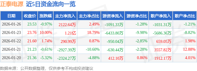 证券之星消息,截至2026年1月26日收盘,正泰电源(002150)报收于23.53元,下跌0.97%,换手率10.08%,成交量36.16万手,成交额8.53亿元。