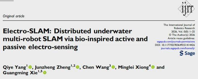 近日,北京大学先进制造与机器人学院谢广明团队在机器人领域国际顶级期刊《The International Journal of Robotics Research》(IJRR)上发表重要研究成果,提出Electro-SLAM——一种集成主动与被动电感知的分布式水下同步定位与建图(SLAM)系统。该研究为复杂、黑暗及浑浊水域中的水下机器人自主感知与协同作业提供了全新解决方案。