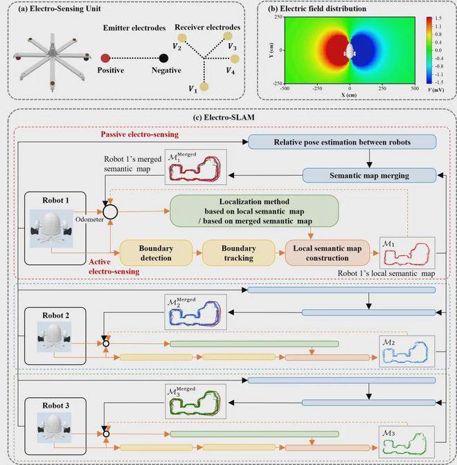 受弱电鱼在黑暗浑浊水域中依赖电感知进行环境探测的生物机制启发,研究团队首次提出以电感知作为主要感知方式的水下SLAM系统框架