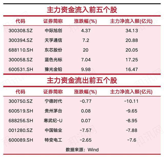 今日主力资金流入前五的个股主要集中在通信、电子和有色金属板块。其中,中际旭创(300308)以34.13亿元的主力资金净流入额位居首位,天孚通信(300394)和东芯股份紧随其后。主力资金流出前五的个股以权重股和前期热门赛道股为主,尽管部分个股仍维持小幅上涨,但资金撤离迹象明显。