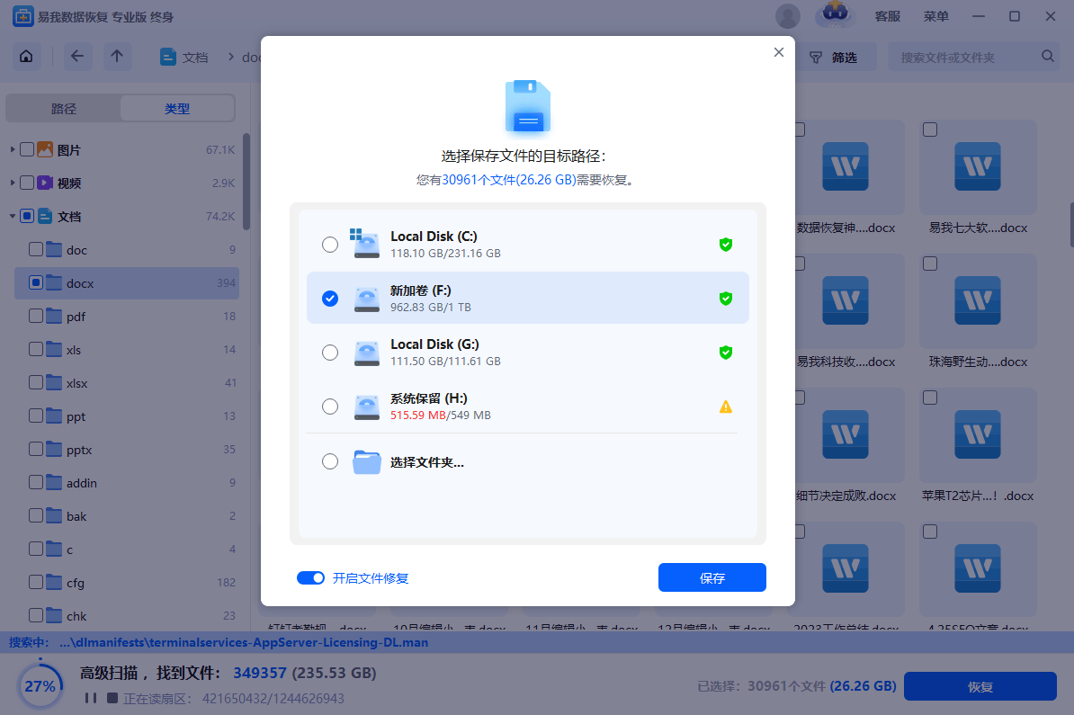 扫描完成后,软件会按文件类型(文档、照片、视频、音频等)分类展示找到的文件,可通过左侧文件类型列表快速筛选;