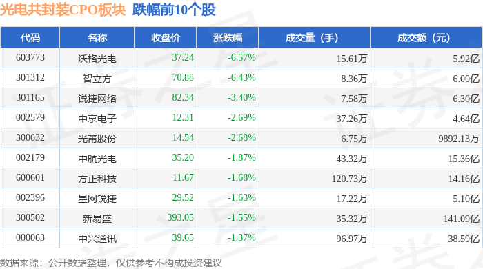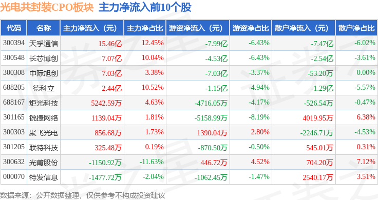 从资金流向上来看,当日光电共封装CPO板块主力资金净流出4.97亿元,游资资金净流出11.52亿元,散户资金净流入16.49亿元。光电共封装CPO板块个股资金流向见下表: