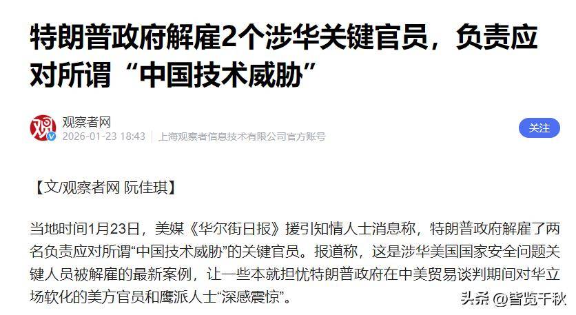 1月22日,就在宣布将于4月访华之后的短短数小时内,特朗普亲自推动解雇了两位关键涉华官员。他们并不是普通文员,而是掌控美国“技术对华封锁”核心逻辑的关键人物。