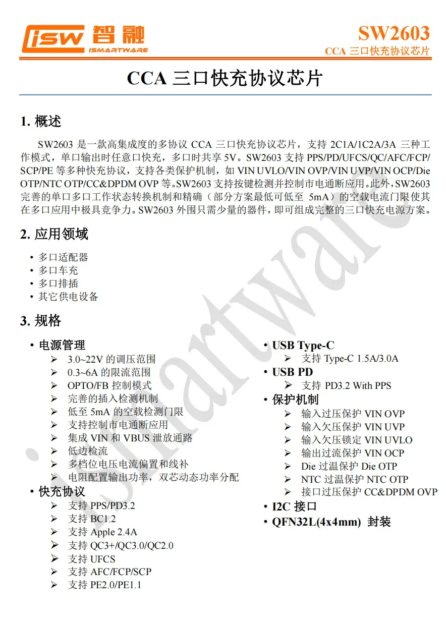 智融科技SW2603是一颗高集成CCA三口快充协议芯片,支持2C1A/1C2A/3A三种工作模式,单口输出时任意口快充,多口时共享5V。SW2603支持PPS/PD/UFCS/QC/AFC/FCP/SCP/PE等多种快充协议,外围只需少量的器件,即可组成完整的三口快充电源方案。