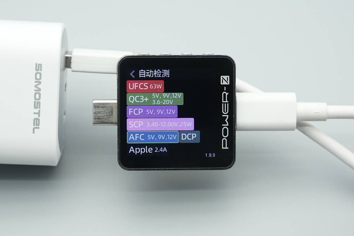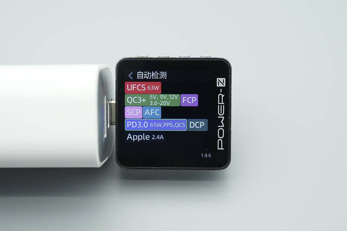 测得USB-A口支持UFCS、QC3+、FCP、SCP、AFC、DCP、Apple 2.4A充电协议。
