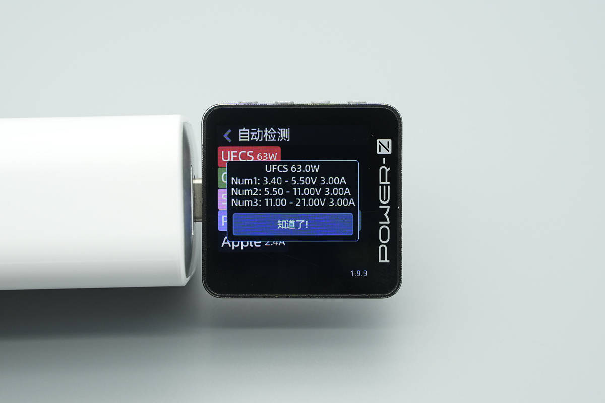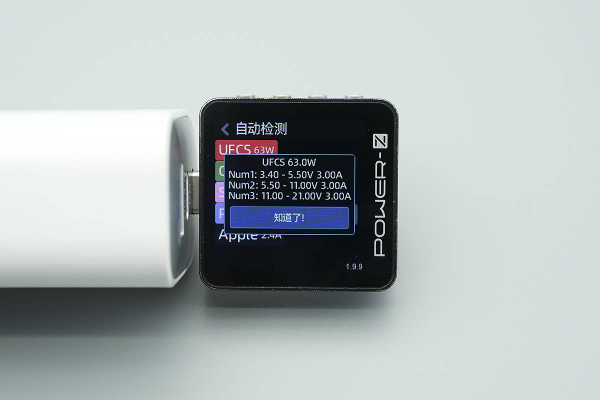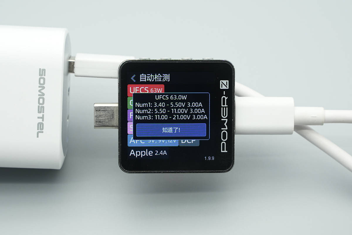 测得UFCS融合快充同样具备3.4-5.5V3A、5.5-11V3A、11-21V3A三组电压档位。