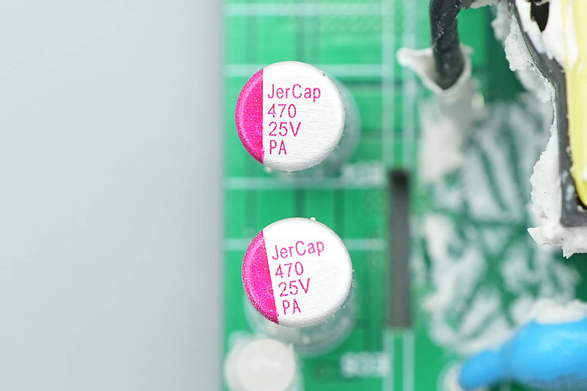 两颗固态滤波电容品牌为JerCap,规格均为25V470μF。