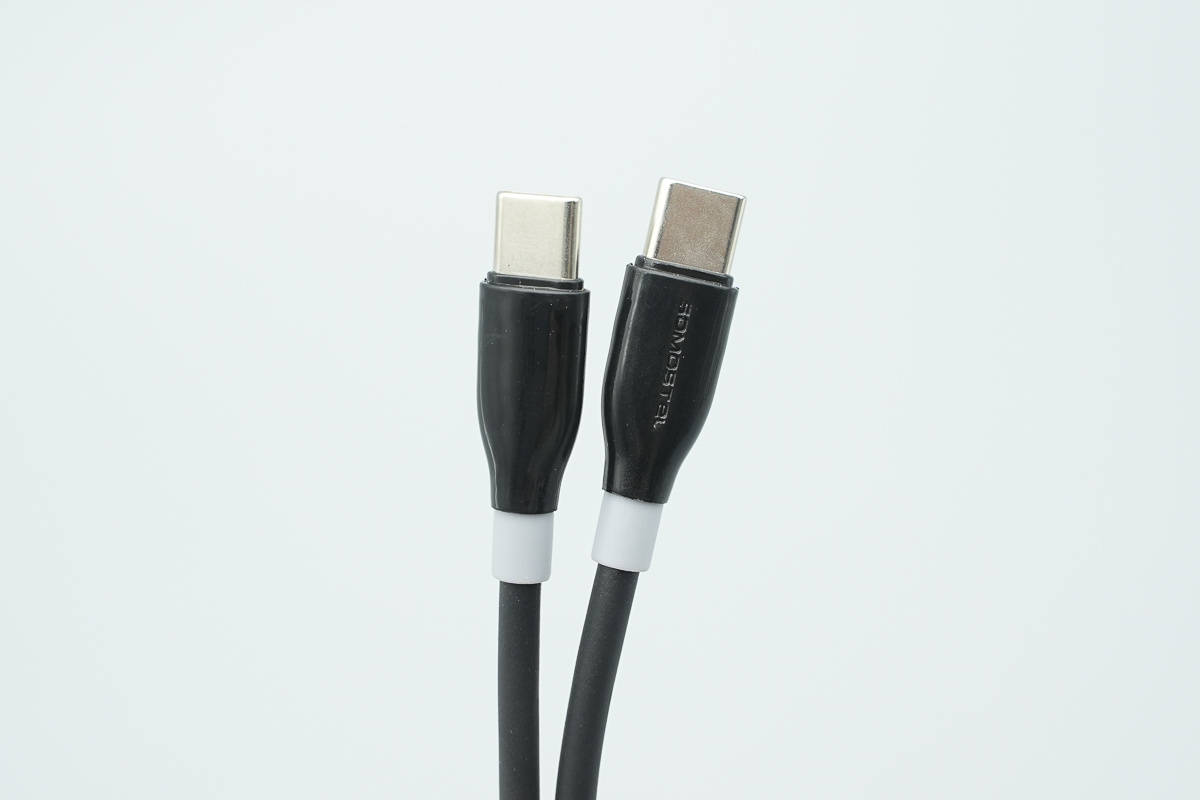 附带数据线为常规黑色USB-C to USB-C线,端子外壳高光亮面处理,并设计有SOMOSTEL品牌。