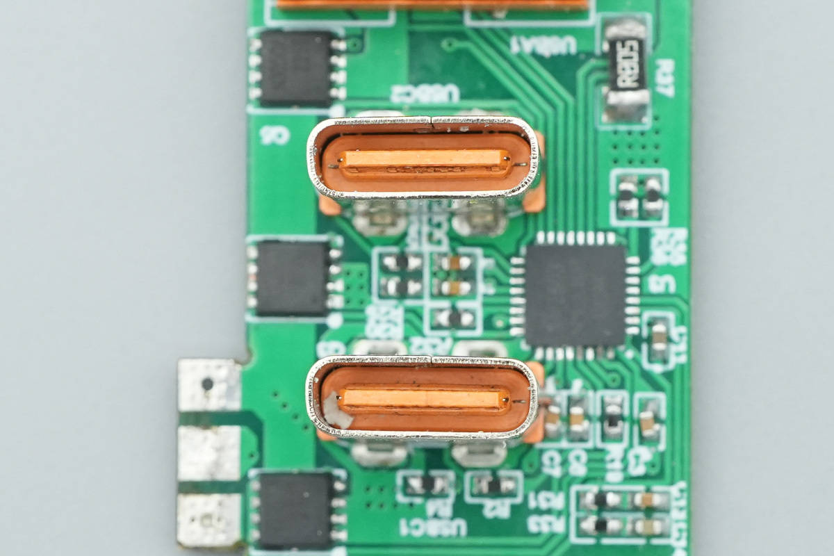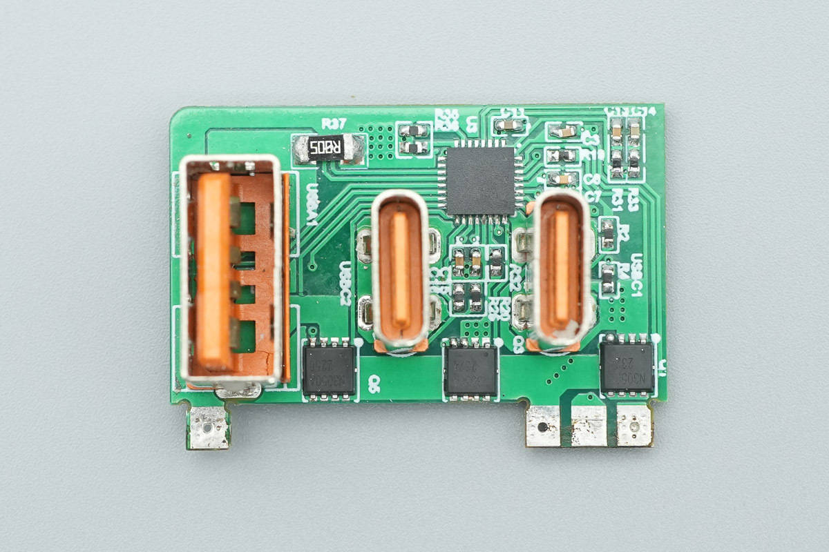 输出端小板正面设有协议芯片、VBUS开关管以及三个USB接口母座。