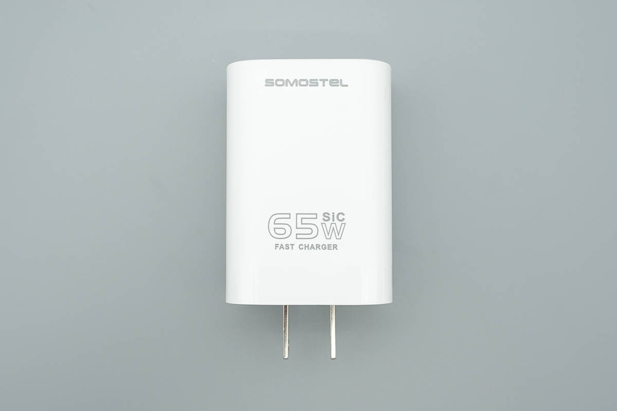 SOMOSTEL 65W碳化硅充电器采用PC阻燃材质白色塑料外壳,机身表面哑光工艺处理,两侧过渡圆润。