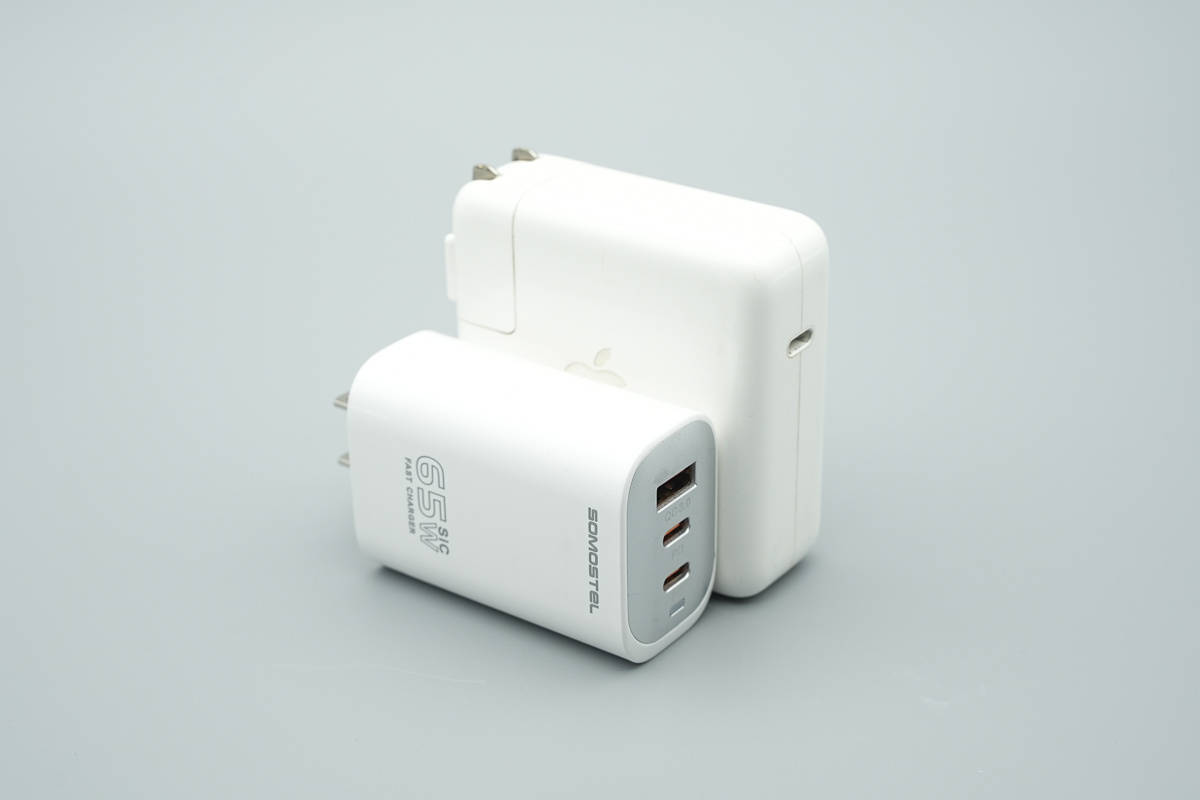 和苹果67W充电器放在一起对比,体积优势明显。