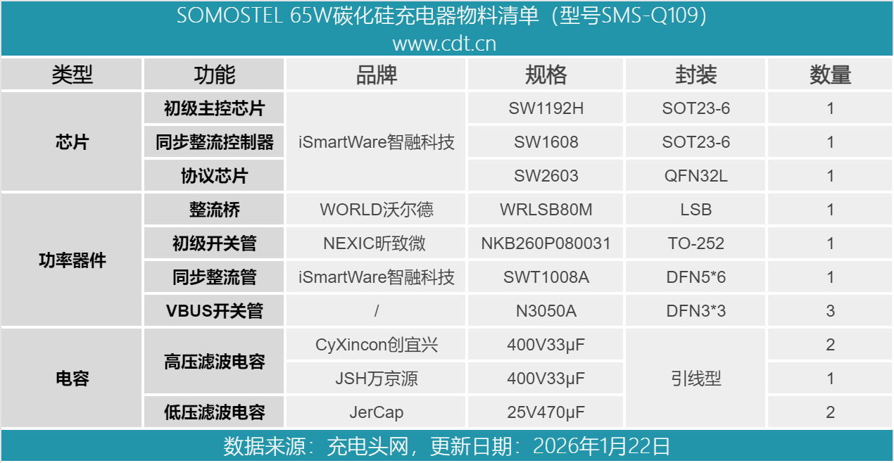最后附上SOMOSTEL 65W碳化硅充电器的核心器件清单,方便大家查阅。