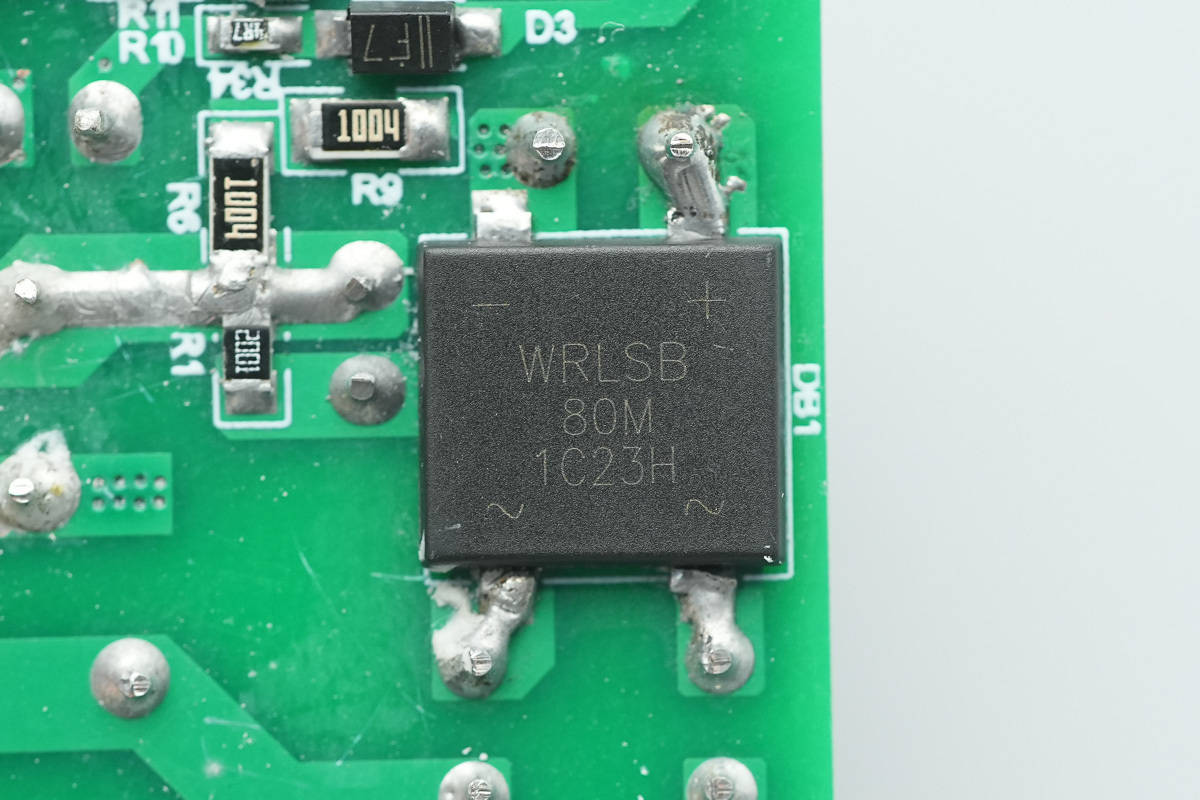 整流桥来自深圳市沃尔德实业有限公司,型号WRLSB80M,这颗软桥通过较软的恢复曲线,比较平滑的关断特性,可以降低二极管结电容达到非常少的谐波振荡产生的效果。选用的LSB封装,拥有良好的散热特性,帮助中大瓦数适配器提升可靠性,单颗可做60W+。