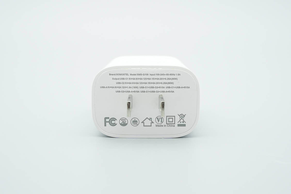 SOMOSTEL 65W碳化硅充电器在性能上表现全面,两个C口均支持65W PD、PPS、QC等主流协议,并加入了63W UFCS融合快充,A口则支持18W输出,能够充分满足手机、平板、笔记本等设备的快充需求。产品体积控制得当,相比传统充电器优势明显,并且接口支持功率盲插,使用体验便捷。