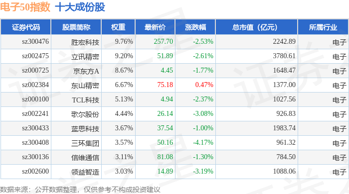 证券之星消息,1月29日,电子50(399281)指数报收于4670.38点,跌2.37%,成交871.79亿元,换手率2.99%。当日该指数成份股中,上涨的有4家,广合科技以1.55%的涨幅领涨,下跌的有46家,精测电子以8.97%的跌幅领跌。