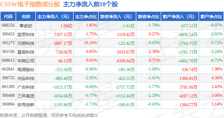 资金流向方面,CSSW电子(399811)指数成份股当日主力资金净流出合计252.17亿元,游资资金净流入合计90.3亿元,散户资金净流入合计161.87亿元。成份股资金流向详情见下表: