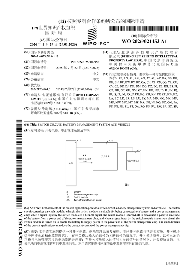 证券之星消息,根据企查查数据显示比亚迪(002594)公布了一项国际专利申请,专利名为“开关电路、电池管理系统及车辆”,专利申请号为PCT/CN2025/109958,国际公布日为2026年1月29日。