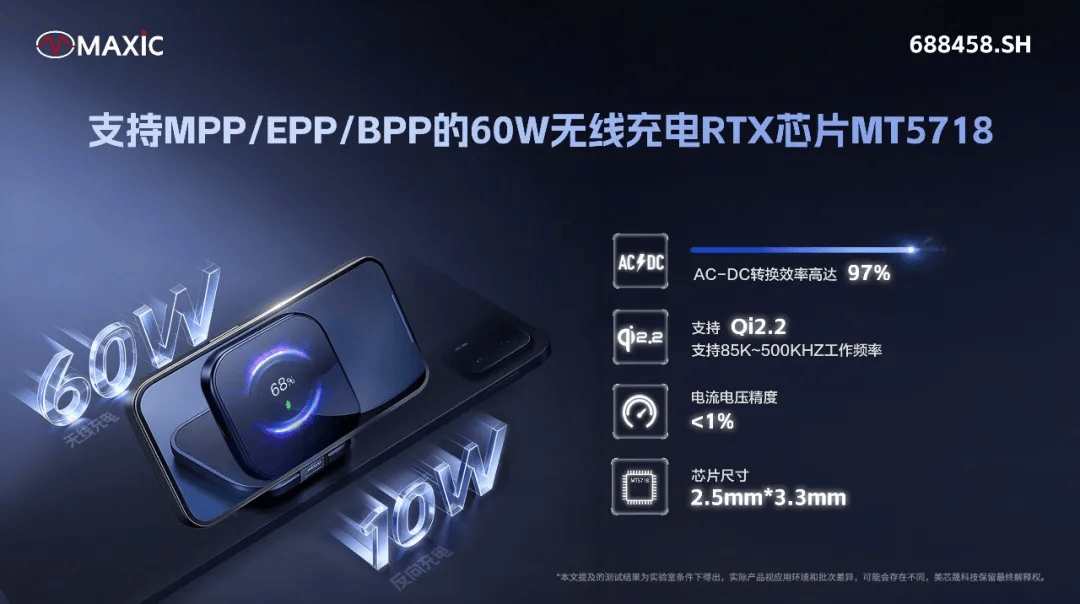 美芯晟最新推出一款支持MPP 25W 、EPP 、BPP全协议兼容的无线充电RTX芯片MT5718,采用2.5mm×3.3mm 40-WLCSP小尺寸封装,支持60W无线充电及10W反向充电。