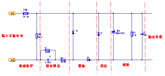 • 阻容降压:在成本要求较低的产品中,X 电容常被用于阻容降压。其工作原理是利用电容在特定交流信号频率下产生的容抗来限制最大工作电流。当在电容器上串联一个阻性元件时,阻性元件两端的电压和功耗由其自身特性决定。因此,电容降压实际上是利用容抗限流,电容器在电路中起到限制电流和动态分配电压的作用。