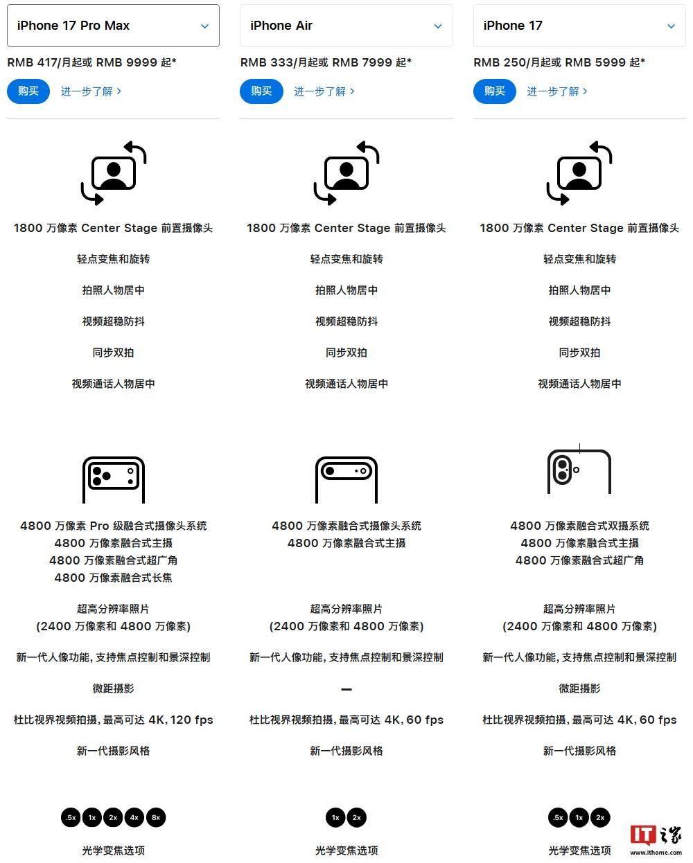 作为参考,本代 iPhone(iPhone 17 / Pro / Pro Max、iPhone Air)升级了 1800 万像素 Center Stage 前置摄像头(采用方形传感器),可实现轻点变焦和旋转、拍照人物居中等功能。