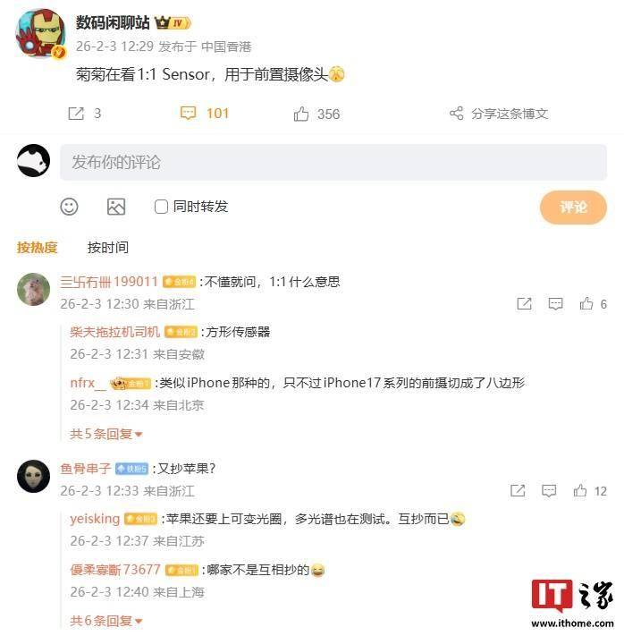 IT之家 2 月 3 日消息,博主 @数码闲聊站 刚刚发文透露,称菊菊(此处预计指代华为)在看 1:1 Sensor 方形传感器,用于前置摄像头。这意味着如果该方案通过,华为新机的前摄将支持更多玩法。
