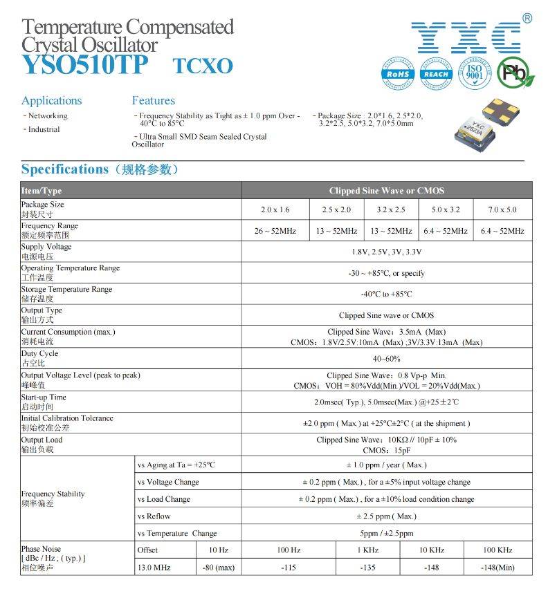 YSO510TP是扬兴科技推出的一款高精度、高稳定性TCXO,能够很好匹配GNSS定位系统对高精度、高稳定性晶振的需求,该系列产品关键指标参数如下: