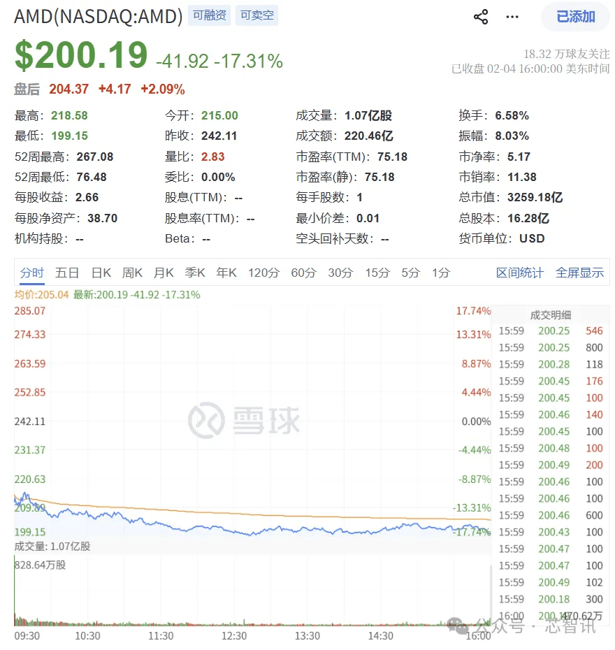 由于第一季财测指引不够强劲,再加上对于来自中国市场数据中心业务营收的大幅下滑,导致AMD股价在盘后大跌,2月4日的美股交易当中更是暴跌17.31%。