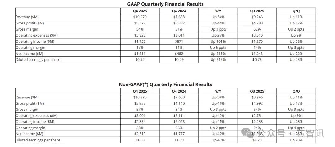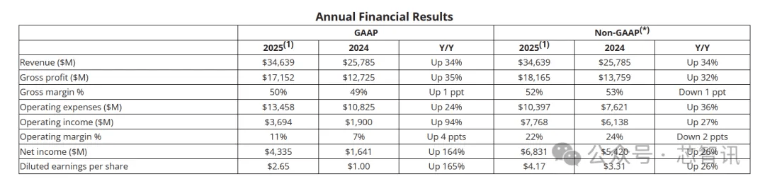 2025财年,AMD营收346亿美元,同比增长34%,创历史新高纪录;营业利润为78亿美元;净利润(Non-GAAP)68.3亿美元,同比增长26%;EPS 则为4.17 美元。