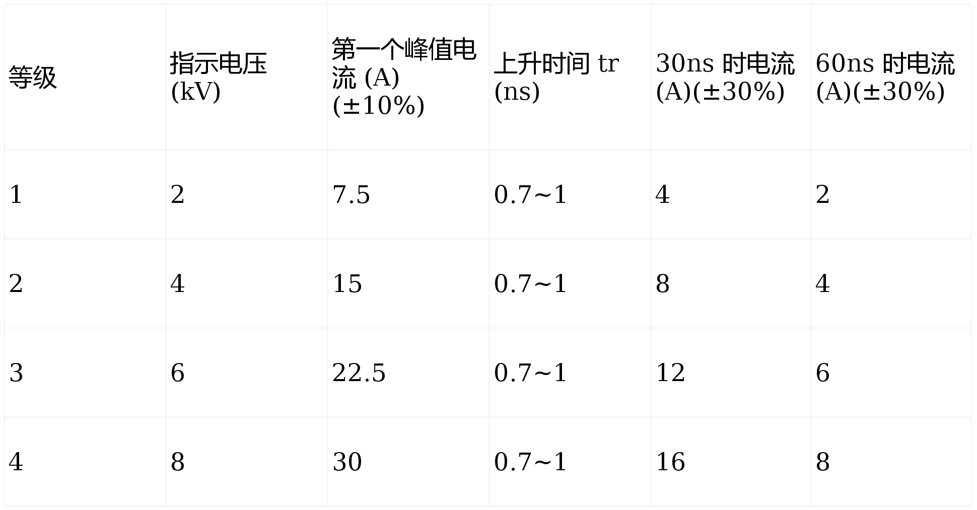 电流波形参数是发生器最重要的技术指标,标准在表 3 中详细规定了各等级的电流波形参数: