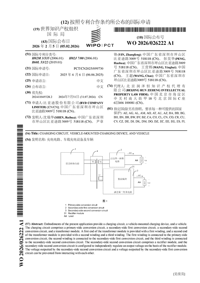 证券之星消息,根据企查查数据显示比亚迪(002594)公布了一项国际专利申请,专利名为“充电电路、车载充电设备及车辆”,专利申请号为PCT/CN2025/099730,国际公布日为2026年2月5日。
