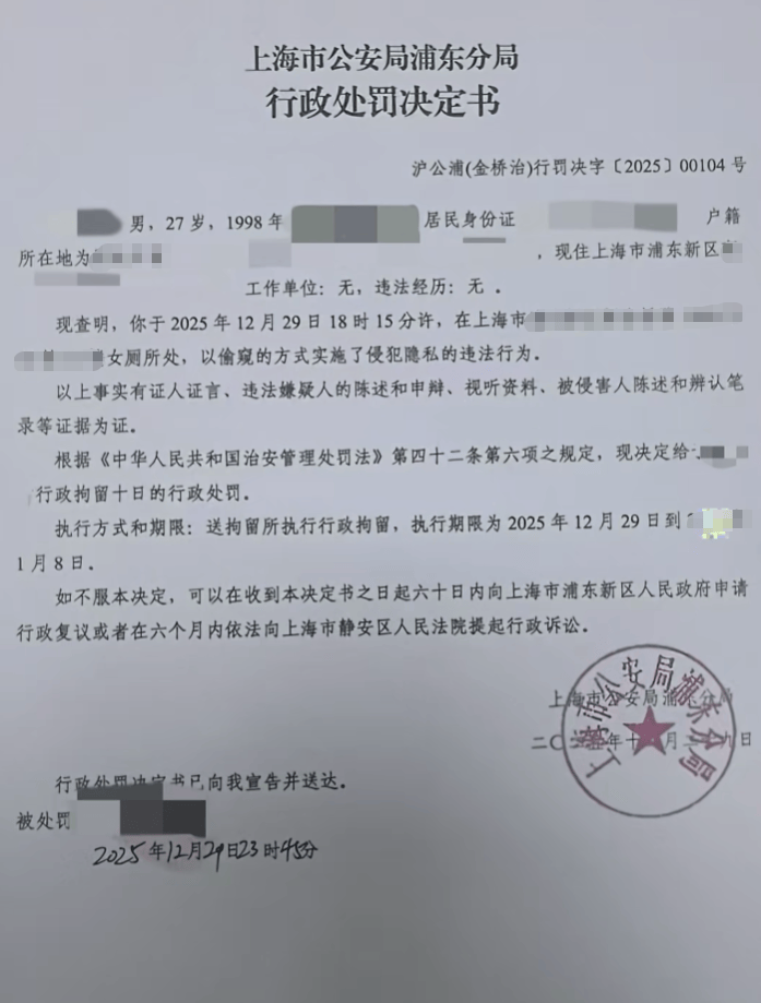 该名男子当场向女子道歉,女子表示道歉没用,该行为已违法。报警处理后,男子被拘留10天。因男子不承认偷拍,最终以偷窥进行了处理。