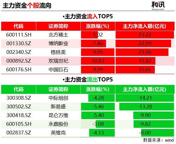 在个股方面,北方稀土以23.22亿元的主力净流入额位居榜首,股价上涨5.02%。紧随其后的是博纳影业与格林美,分别获主力净流入22.09亿元和21.06亿元,涨幅均超过7%。