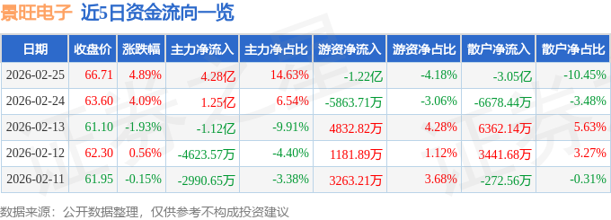 证券之星消息,截至2026年2月25日收盘,景旺电子(603228)报收于66.71元,上涨4.89%,换手率4.55%,成交量44.42万手,成交额29.24亿元。