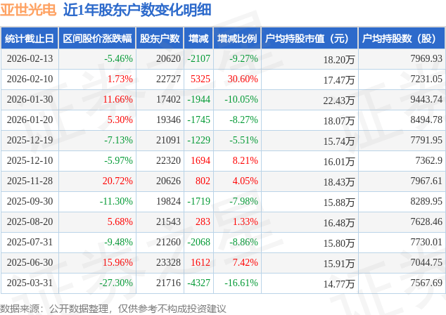 从股价来看,2026年2月10日至2026年2月13日,亚世光电区间跌幅为5.46%,在此期间股东户数减少2107.0户,减幅为9.27%。