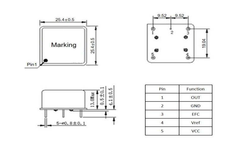 1、VCC 主电源输入(+3.3V/+5V/+12V) 2、GND 接地管脚 3、EFC/VC 压控电压输入 4、OUT 主频率输出 5、Vref or NC 参考电压或者不接