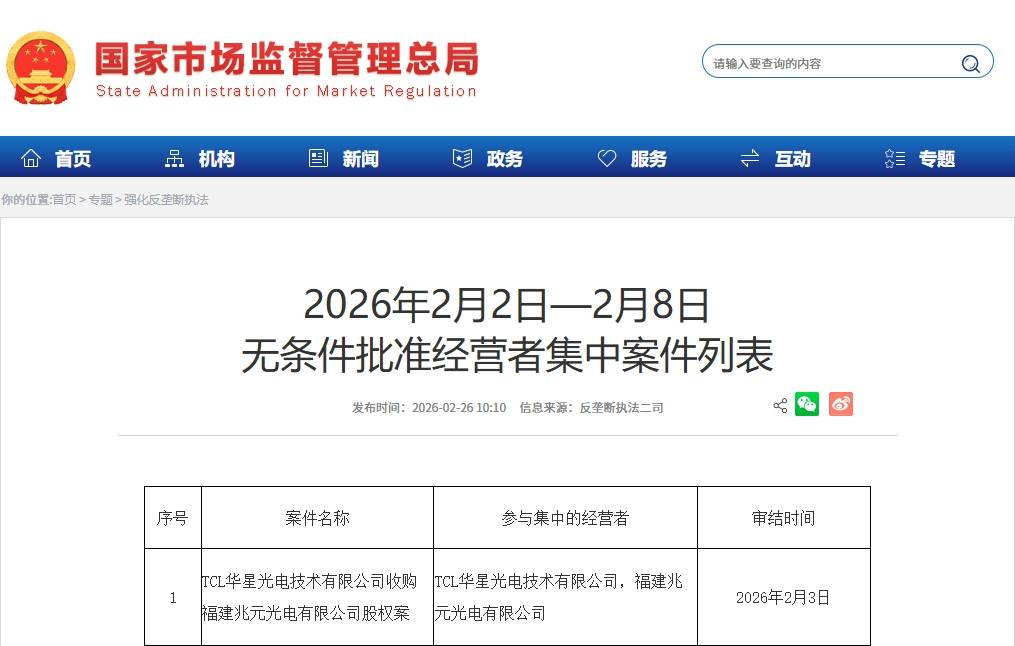 上证报中国证券网讯(记者 邹传科)2月27日,记者从TCL科技获悉,国家市场监督管理总局日前发布的《2026年2月2日-2月8日无条件批准经营者集中案件列表》显示,TCL科技子公司TCL华星光电技术有限公司(以下简称“TCL华星”)收购福建兆元光电有限公司(以下简称“兆元光电”)股权案已获无条件批准,正式通过反垄断审查。