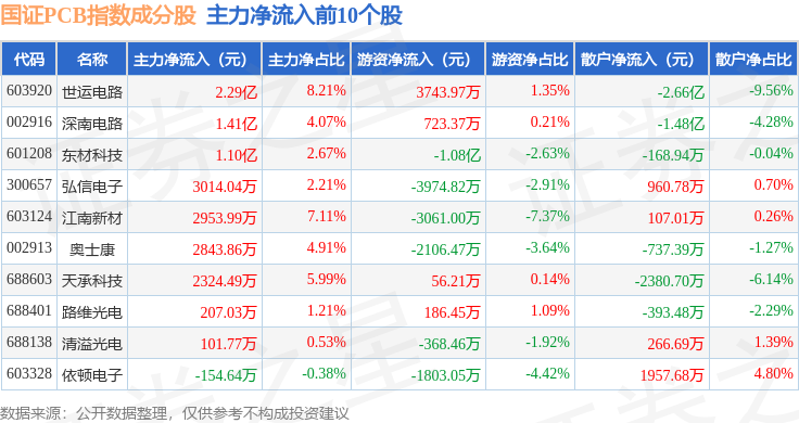 资金流向方面,国证PCB(980115)指数成份股当日主力资金净流出合计54.96亿元,游资资金净流入合计9.34亿元,散户资金净流入合计45.62亿元。成份股资金流向详情见下表: