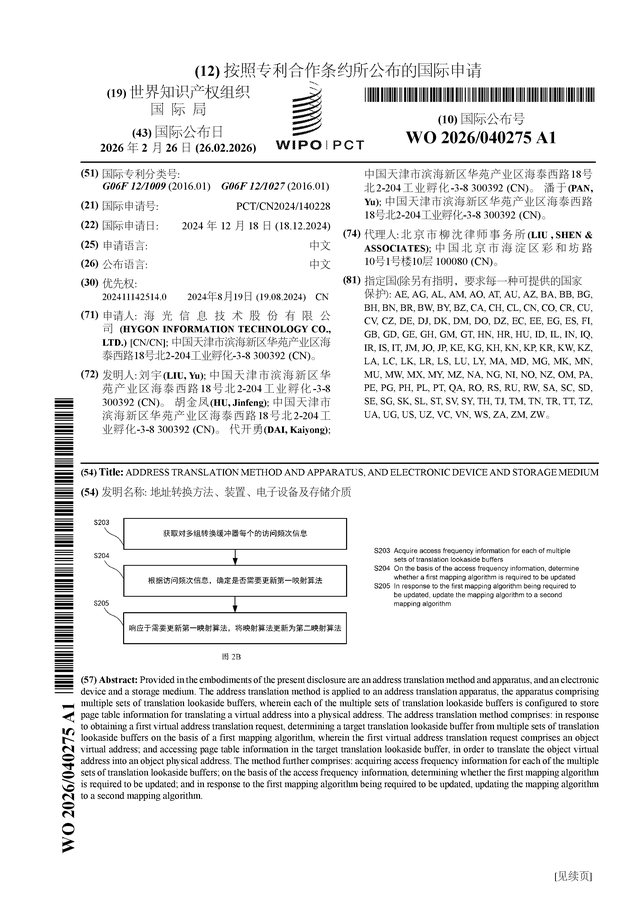 证券之星消息,根据企查查数据显示海光信息(688041)公布了一项国际专利申请,专利名为“地址转换方法、装置、电子设备及存储介质”,专利申请号为PCT/CN2024/140228,国际公布日为2026年2月26日。