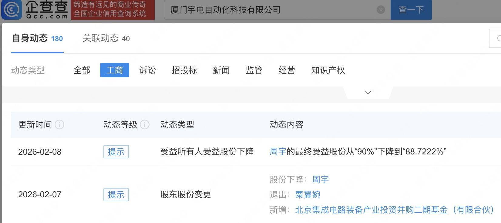 企查查APP显示,近日,宇电温控科技关联公司厦门宇电自动化科技有限公司发生工商变更,新增北京集成电路装备产业投资并购二期基金(有限合伙)为股东。企查查信息显示,该公司成立于1998年,经营范围包含:计算机单片机嵌入式系统软件开发生产、系统集成、应用服务和其他相应技术服务等。据其官网,宇电温控科技专注于智能温控器研发与生产。