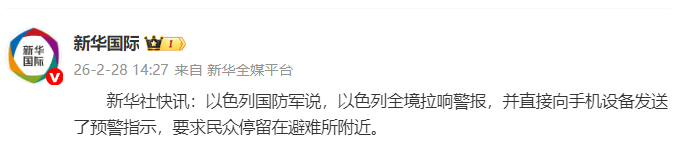 新华社快讯:以色列国防军说,以色列全境拉响警报,并直接向手机设备发送了预警指示,要求民众停留在避难所附近。