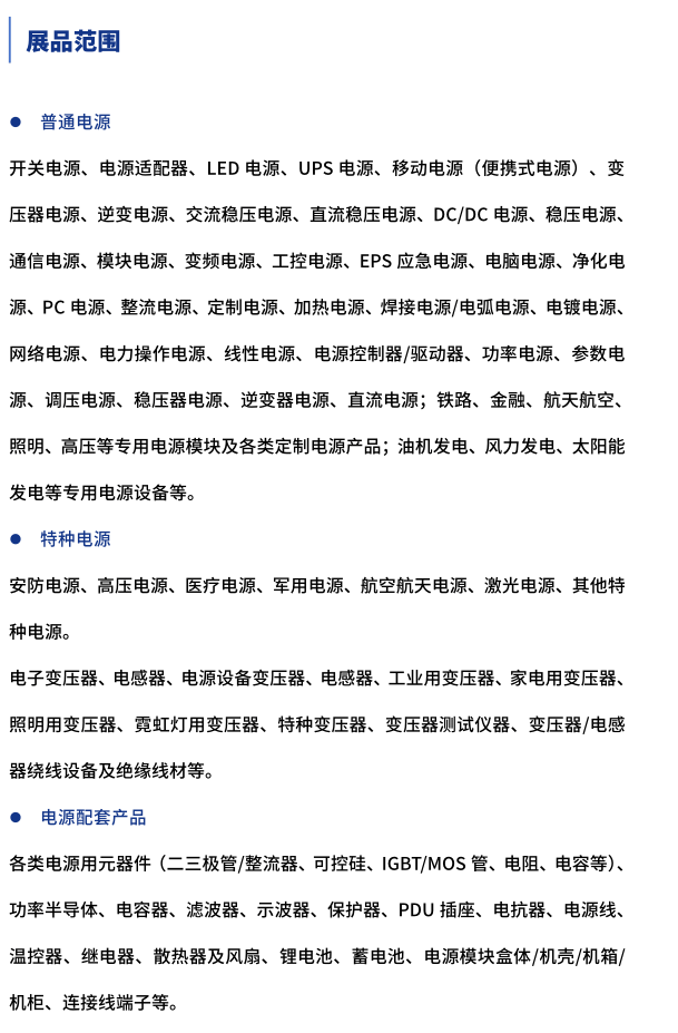展会以 “电源” 为主题,聚焦全球电源产业的前沿技术与创新应用,全面展示电源制造、储能系统、分布式能源、电源模块、新能源车载电源、工业与通信电源、充电技术及电能管理系统等领域的最新成果。 从常见的手机充电器、电脑电源适配器,到应用于工业领域的大型 UPS 不间断电源,再到代表未来发展方向的新能源汽车充电桩、分布式能源系统中的电源设备等,你都能在这里找到。无论是对个人消费者,还是对企业采购商、行业从业者来说,都极具吸引力。
