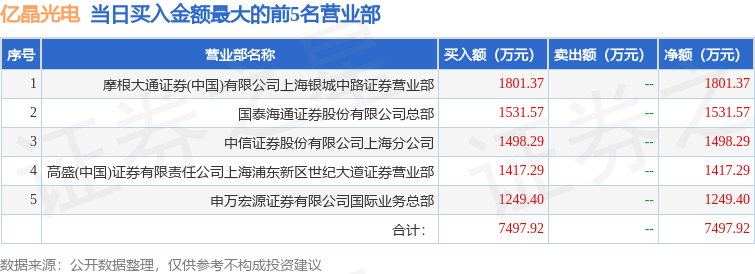 证券小知识:龙虎榜是交易所披露的竞价交易公开信息,现身龙虎榜的个股都是当日最为活跃的个股,是投资者日常重点关注的数据。交易所公布当日买入金额和卖出金额前五名的席位,其中一些席位代表特殊意义,如机构专用席位是指基金专用席位、券商自营专用席位、社保专用席位、券商理财专用席位、保险机构专用席位、保险机构租用席位、QFII专用席位等机构投资者买卖证券的专用通道和席位。深股通专用、沪股通专用为北向资金的交易席位。
