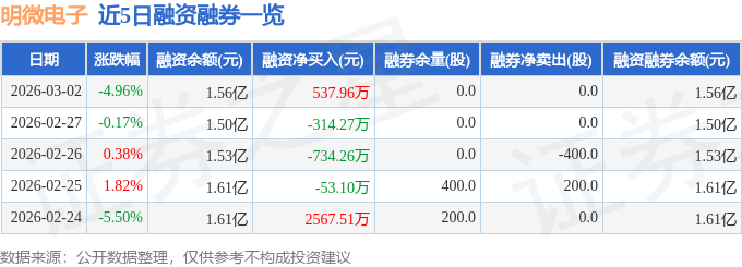 明微电子融资融券信息显示,融资方面,当日融资买入2225.16万元,融资偿还1687.21万元,融资净买入537.96万元。融券方面,融券卖出0.0股,融券偿还0.0股,融券余量0.0股,融券余额0.0万元。融资融券余额1.56亿元。