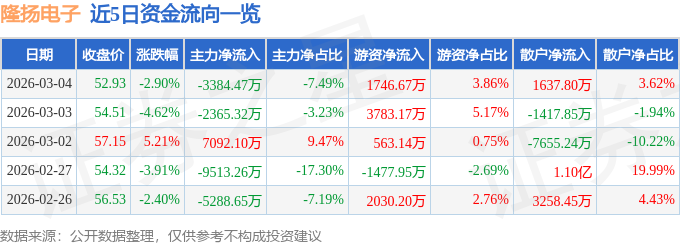 证券之星消息,截至2026年3月4日收盘,隆扬电子(301389)报收于52.93元,下跌2.9%,换手率9.98%,成交量8.44万手,成交额4.52亿元。
