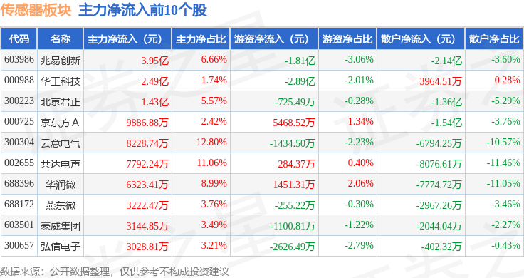 从资金流向上来看,当日传感器板块主力资金净流出11.35亿元,游资资金净流出1173.29万元,散户资金净流入11.47亿元。传感器板块个股资金流向见下表: